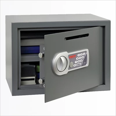Электронный замок запирается цифровым кодом, от трёх до восьми цифр; предусмотрена система защиты от подбора кода, а также система звукового и светового оповещения. Шифр без труда можно поменять, что актуально при использовании в гостиницах и отелях. К замку прилагается аварийный мастер-ключ, позволяющий открыть сейф при утере кода. Для питания замка требуется четыре батарейки класса АА.