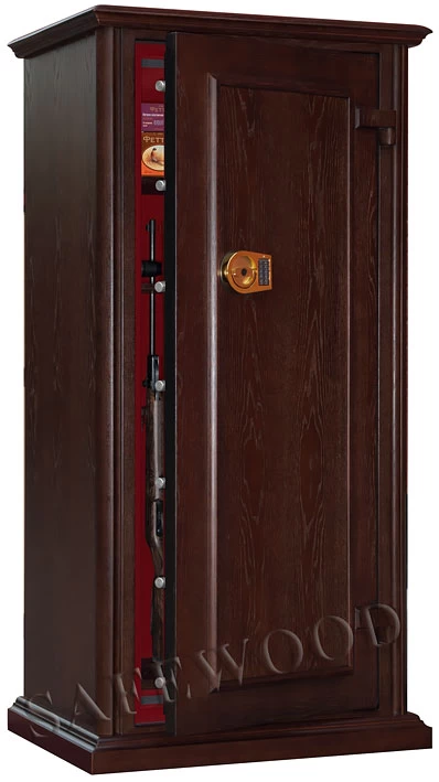 Внутри сейфа расположены шесть деревянных съёмных полок, позволяющие оптимальное регулирование по высоте и деревянный ложемент на 9 ружей.